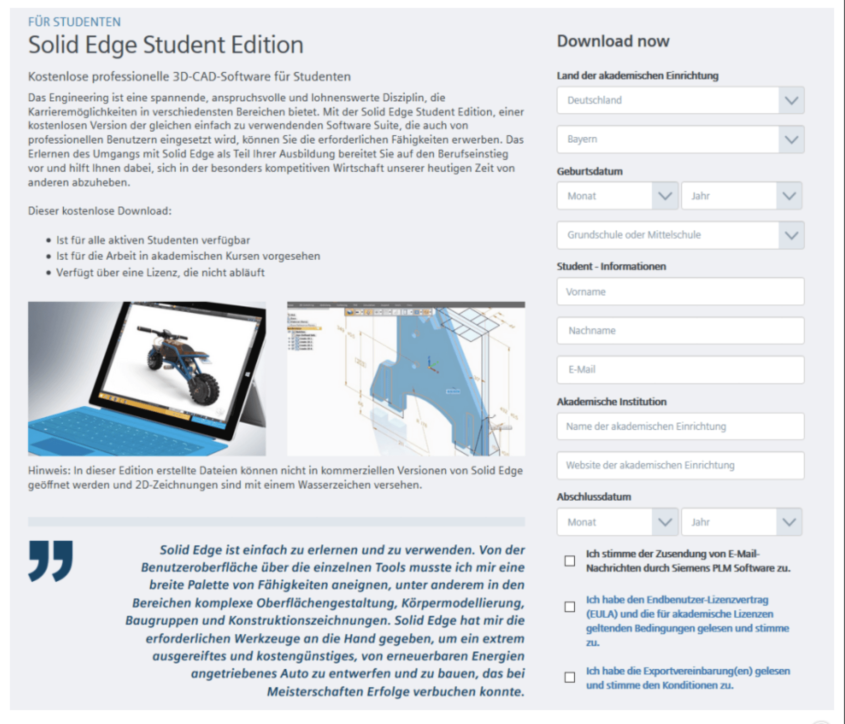 Um die aktuelle Solid Edge Version herunter laden zu können, musst du die Anmeldemaske ausfüllen. Danach bekommst du per E-Mail einen Link zum Downloaden der Datei (ca. 2 GB). Das Progamm ist für Schüler kostenlos!